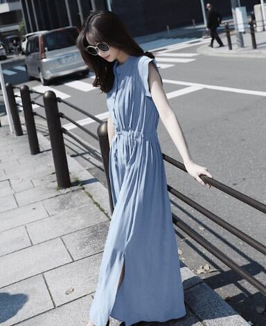 レディース/ロングドレス/ワンピース/夏/春/大人可愛い/お姉さん/ロングワンピース/ノースリーブ/スリム/細身/上品/きれいめ/夏コーデ/スリット/おしゃれ/清楚/スカイブルー