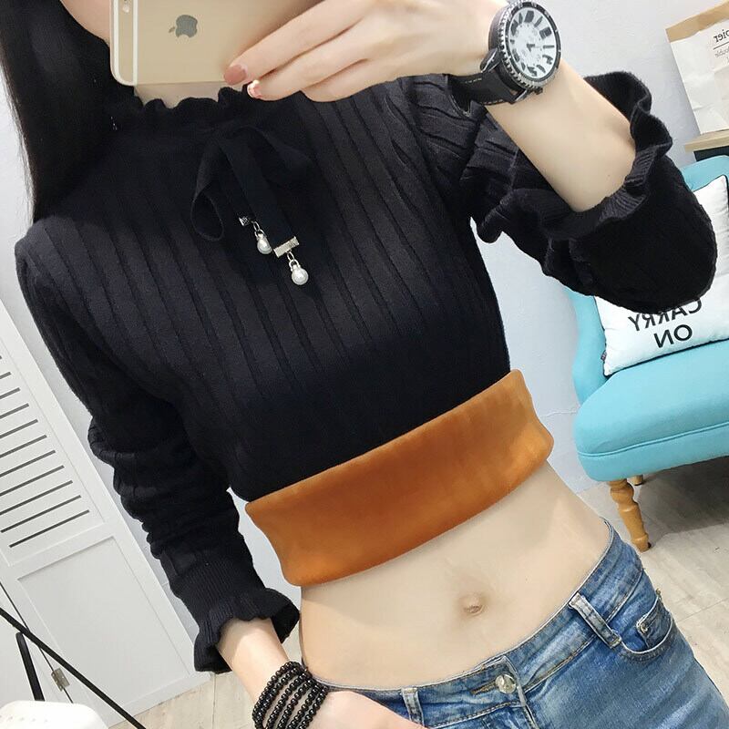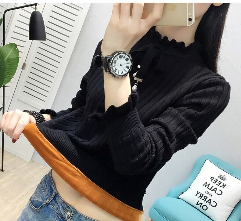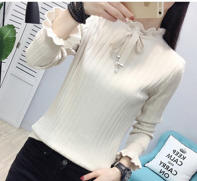 レディースファッション/レディース/秋/冬/長袖/カットソー/ニット/セーター/リブニット/スリム/きれいめ/フリルネック/ハイネック/フリルスリーブ/リボン/チャーム/装飾/フリース裏地/あったか/防寒/上品/韓国
