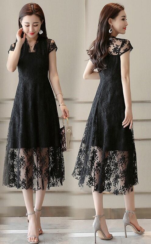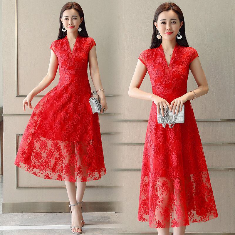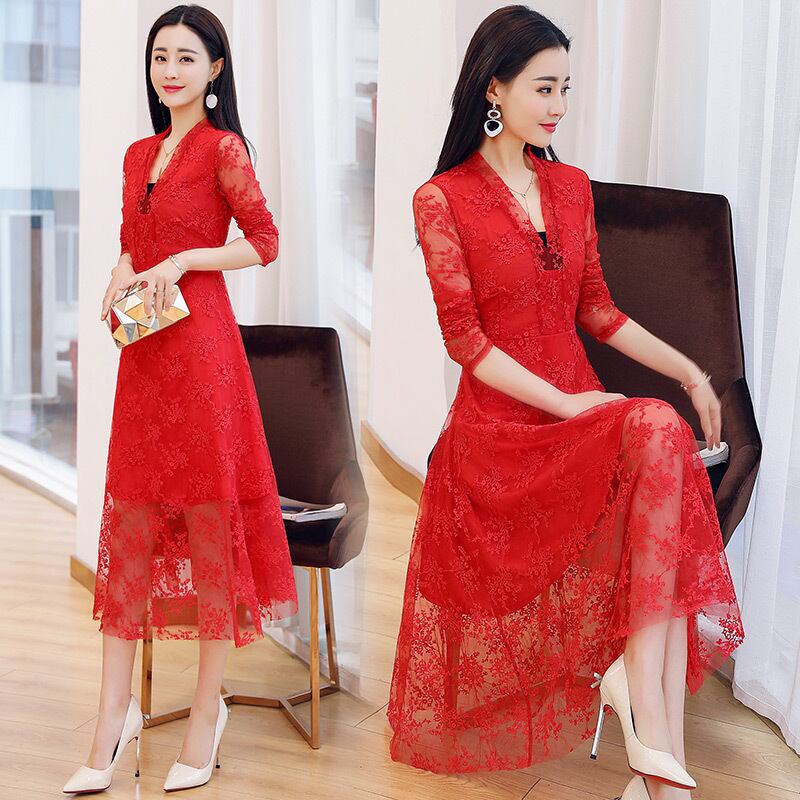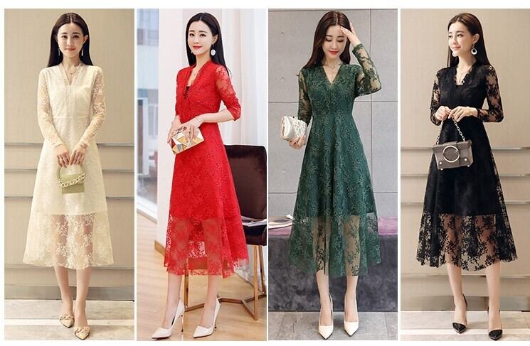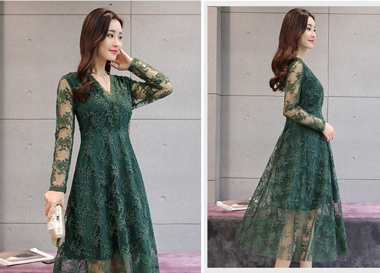 ワンピース/長袖/レディース/ファッション/2019年/夏/スリム/Vネック/ドレス/レース/ポリエステル/オシャレ/セクシー/M/L/XL/2XL/3XL/ブラック/グリーン/ブラック/ベージュ/レッド